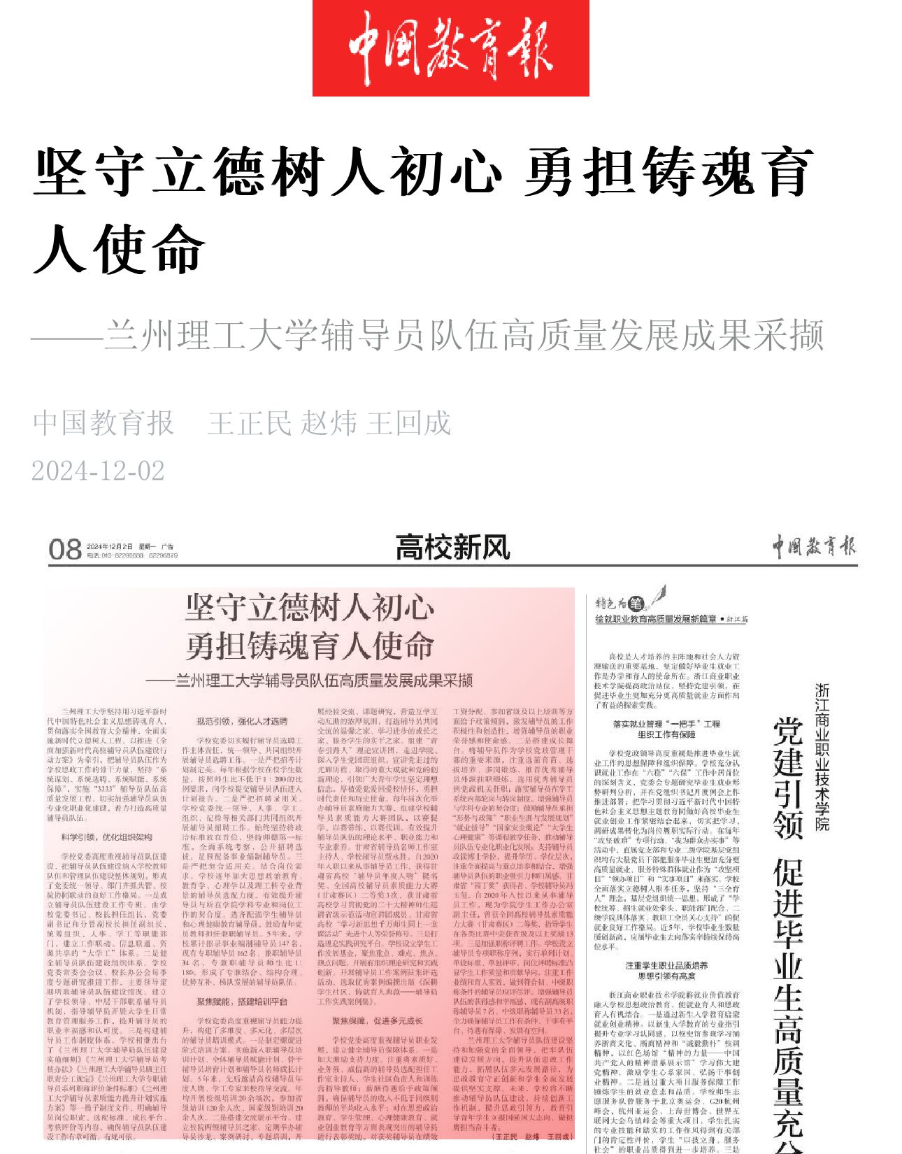 為全面貫徹落實黨的二十屆三中全會精神和全國、全省教育大會精神,深入推進教育部《全面加強新時代高校輔導員隊伍建設(shè)行動方案》,集中展示學校輔導員隊伍建設(shè)成果,近日,由黨委學生工作部撰寫的“堅守立德樹人初心 勇?lián)T魂育人使命—蘭州理工大學輔導員隊伍高質(zhì)量發(fā)展成果采擷”一文被《中國教育報》刊登,引發(fā)關(guān)注和好評。