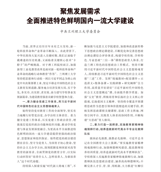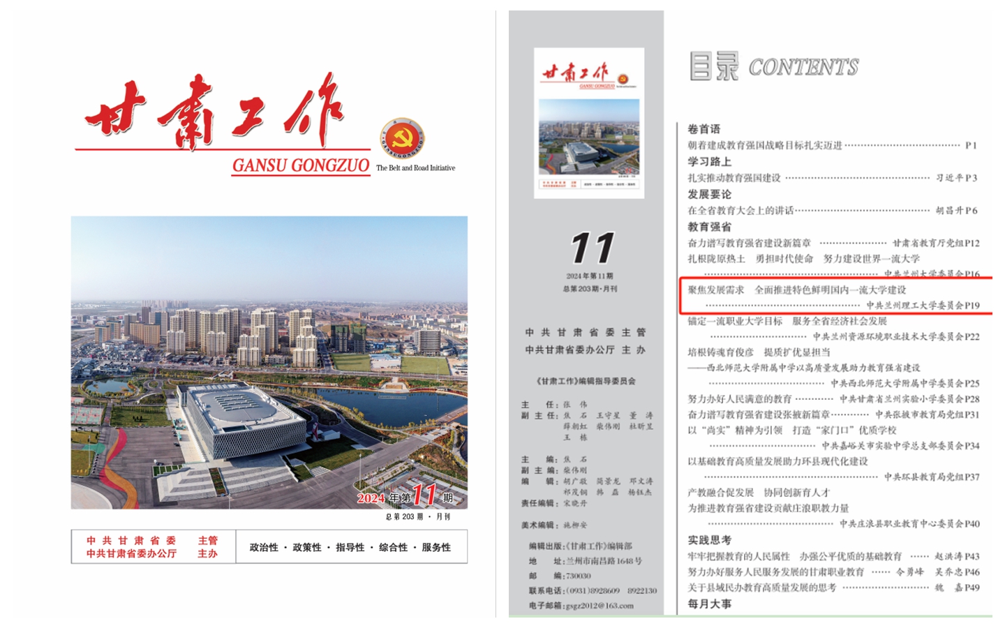 近日,由中共甘肅省委主管、中共甘肅省委辦公廳主辦的《甘肅工作》雜志(第11期)刊發(fā)中共蘭州理工大學(xué)委員會(huì)《聚焦發(fā)展需求 全面推進(jìn)特色鮮明國(guó)內(nèi)一流大學(xué)建設(shè)》文章,并進(jìn)行封面報(bào)道。全文如下: