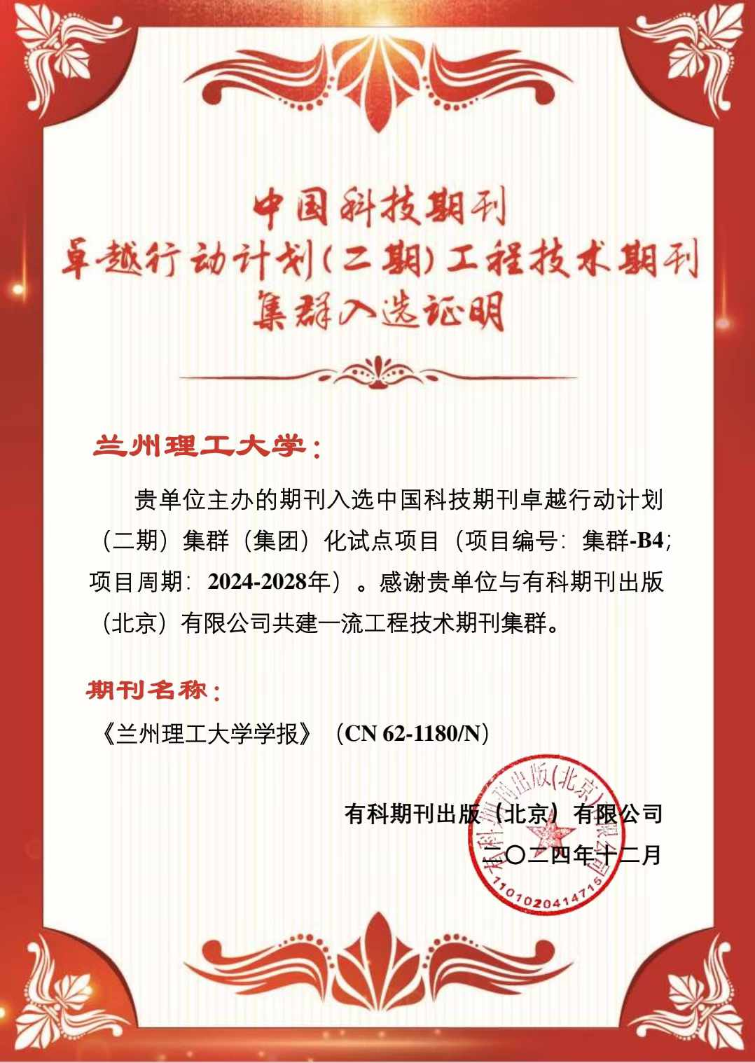 近日,《蘭州理工大學學報》入選了中國科技期刊卓越行動計劃(二期)工程技術期刊集群、榮獲了“2024年度中國高??萍计诳ㄔO示范案例庫——優秀科技期刊”獎項。這些榮譽的獲得,是對學報長期以來堅持高質量學術出版、積極推動學術交流與合作的充分肯定。
