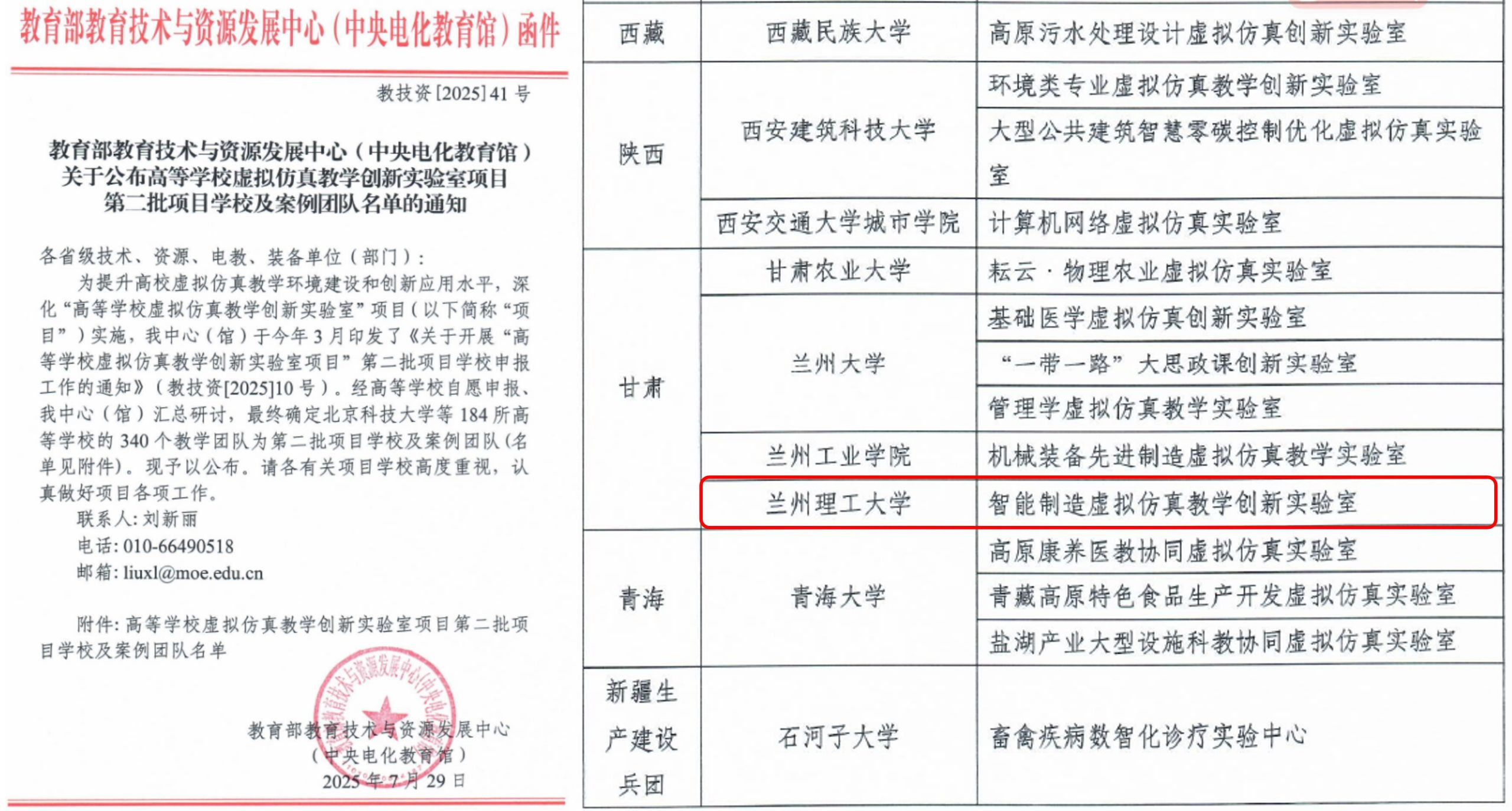 7月29日,教育部教育技術與資源發展中心(中央電化教育館)公布了高等學校虛擬仿真教學創新實驗室項目第二批名單。經嚴格遴選,全國共有184所高校的340個教學團隊成功入選,蘭州理工大學申報的“智能制造虛擬仿真教學創新實驗室”項目位列其中。