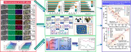 基于上述發(fā)現(xiàn),團隊構建了多熵-性能耦合模型,成功實現(xiàn)對AlSi10MnMg合金性能的準確預測,為高導熱、高強鋁合金的定向設計提供了理論依據(jù)。此外,團隊優(yōu)化了有效介質理論,引入晶界散射、固溶原子衰減及界面態(tài)密度等多物理場因素,建立起熱導率預測新模型,其預測誤差低于10%,顯著提升了合金設計的精確性。在工藝研究方面,團隊系統(tǒng)比較了金屬型鑄造、受控擴散凝固與軋制三種工藝所制備的Al–5Sr–5Sb變質劑對AlSi10MnMg合金組織與性能的影響,最終實現(xiàn)了強度與導熱性的協(xié)同提升。該研究突破了鋁合金“強度-導熱”協(xié)同提升的技術瓶頸,形成了具有自主知識產權的新材料設計與制備技術體系。(圖/文:李元東、周宏偉;審核:蒲瑞琛)