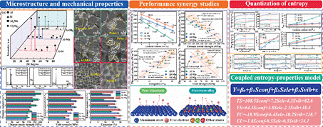 研究團隊創(chuàng)新提出融合電子熵、構型熵與振動熵的“多熵耦合”設計框架理論,結合第一性原理計算與實驗驗證,系統(tǒng)揭示了Al–Si、Al–Mg及Al–Mn三種合金體系中熵參數(shù)對性能的影響機制。研究表明,構型熵是提高合金強度的關鍵因素,而電子熵與振動熵通過增強電子-聲子散射顯著降低導熱率。