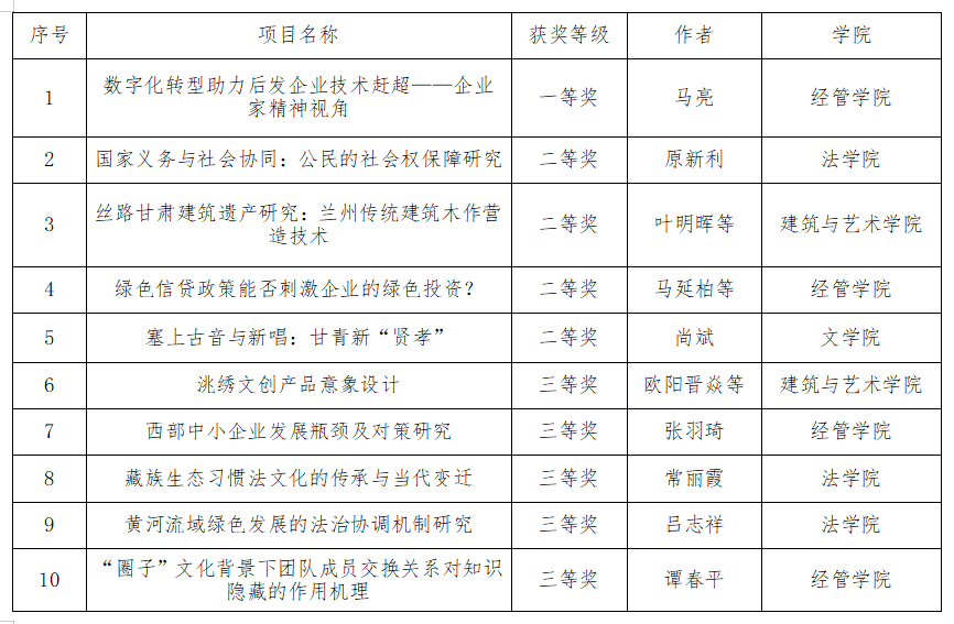 近日,甘肅省社科聯發布了《關于對甘肅省第十八屆哲學社會科學優秀成果獎擬獲獎成果名單進行公示的公告》,我校共有10項成果獲獎,其中一等獎1項,二等獎4項,三等獎5項,展現出我校在經濟管理、法學、文學、建筑藝術等研究方向上的深厚積累與創新突破。