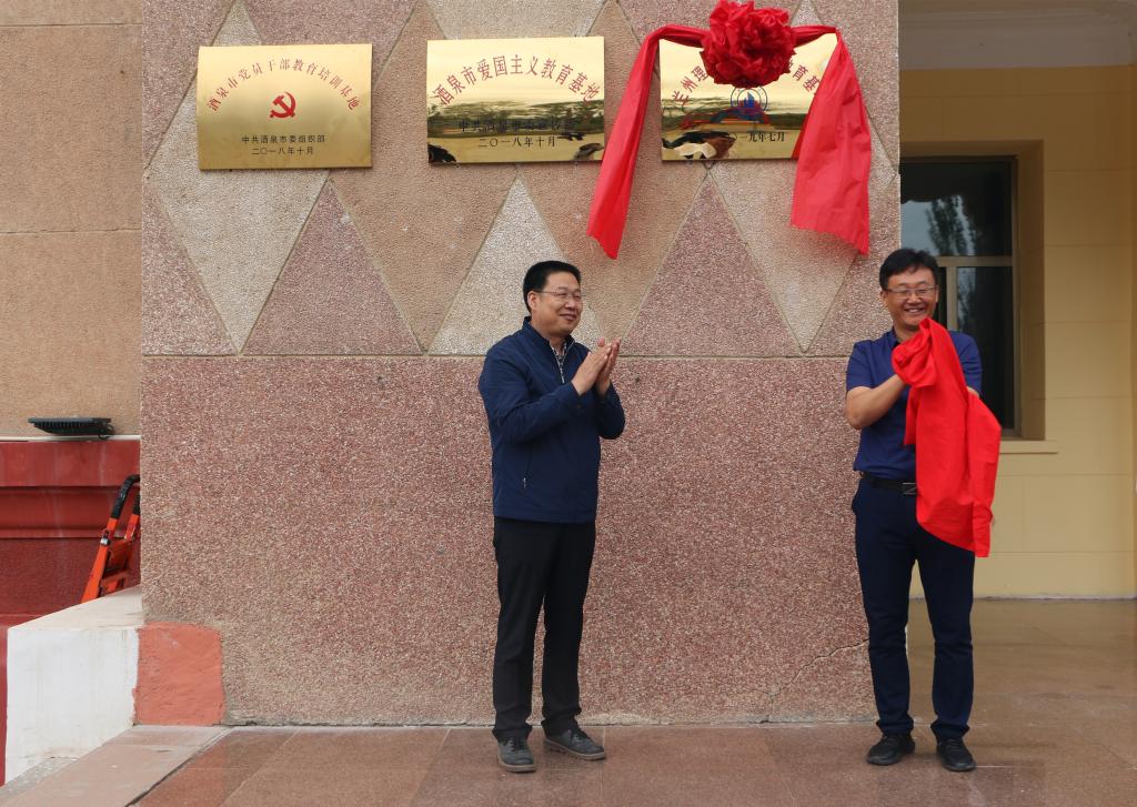 玉門市委副書記王超和學校黨委副書記丁虎生為教育基地揭牌