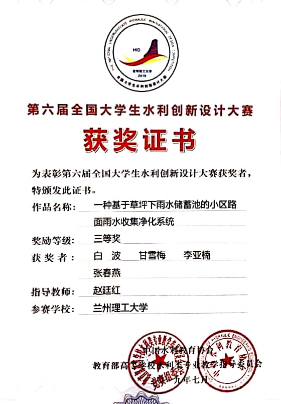 經過賽前5個多月的準備以及比賽兩天的激烈角逐,由能源與動力工程學院趙文舉老師、范嚴偉老師指導,錢俊杰、陳庭興、楊柳崴、李怡瑤、蘇東星同學完成的作品《一種壓力輸水管道出口處消能發電系統》;樊新建老師指導,姚薇、朱廣東、朱文強同學完成的作品《一種基于末端水流的發電消能節能裝置》獲一等獎。由趙廷紅老師指導,白波、甘雪梅、李亞楠、張春燕同學完成的作品《一種基于草坪下雨水儲蓄池的小區路面雨水收集凈化系統》獲三等獎。
