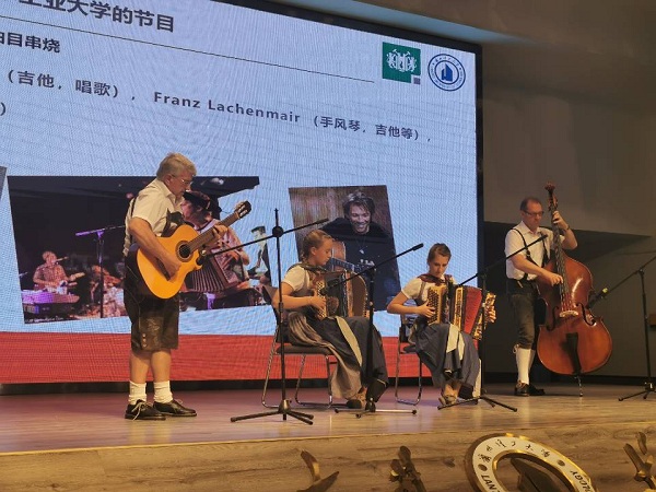 音樂交流中,由德國學生施蒂里亞手風琴雙人組合和三人樂隊Maulquappen 組合分別帶來手風琴樂曲串燒和巴伐利曲目串燒,樂器種類豐富,樂曲優美動聽,表演詼諧有趣,展現了濃郁的德國傳統音樂風格。學校紅柳藝術團帶來了古典舞《書簡》和三人小合唱《生來倔強》。《書簡》舞為中國古典漢唐舞蹈風格,表達了女子手持書簡,熱愛學習,了解天下之事的抱負。舞蹈力度與柔美共存,或素淡,有女兒之嬉戲;或張揚,有書生之抱負,顯示著中華民族之魂。歌曲《生來倔強》用鏗鏘有力的旋律和熱血激蕩的歌詞,唱出中國青年人從不服輸、永不言敗的精神力量,表現了青年人對祖國和民族的熱愛。兩首作品分別展現了中華民族悠久的歷史、文化以及當代中國青年人新的時代風貌。