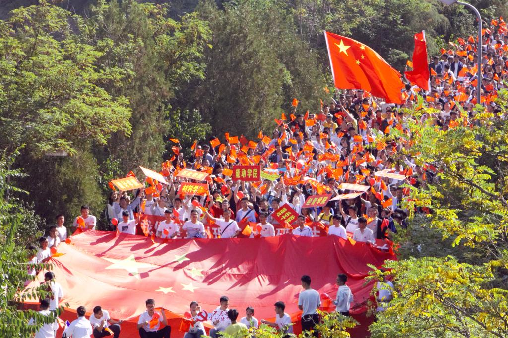 大家一起揮動手中的五星紅旗,以青春之名,齊聲告白,讓嘹亮的聲音在空中回蕩,讓愛國的情懷無限升華。