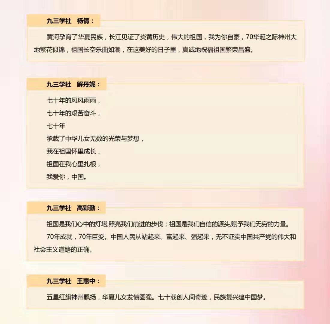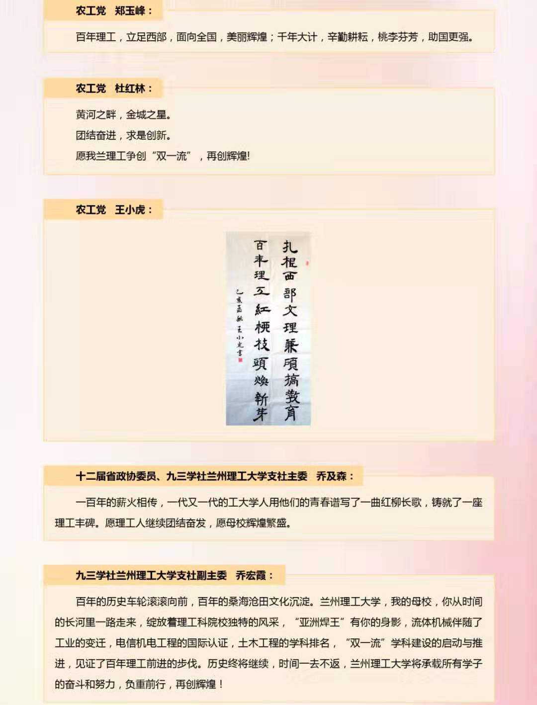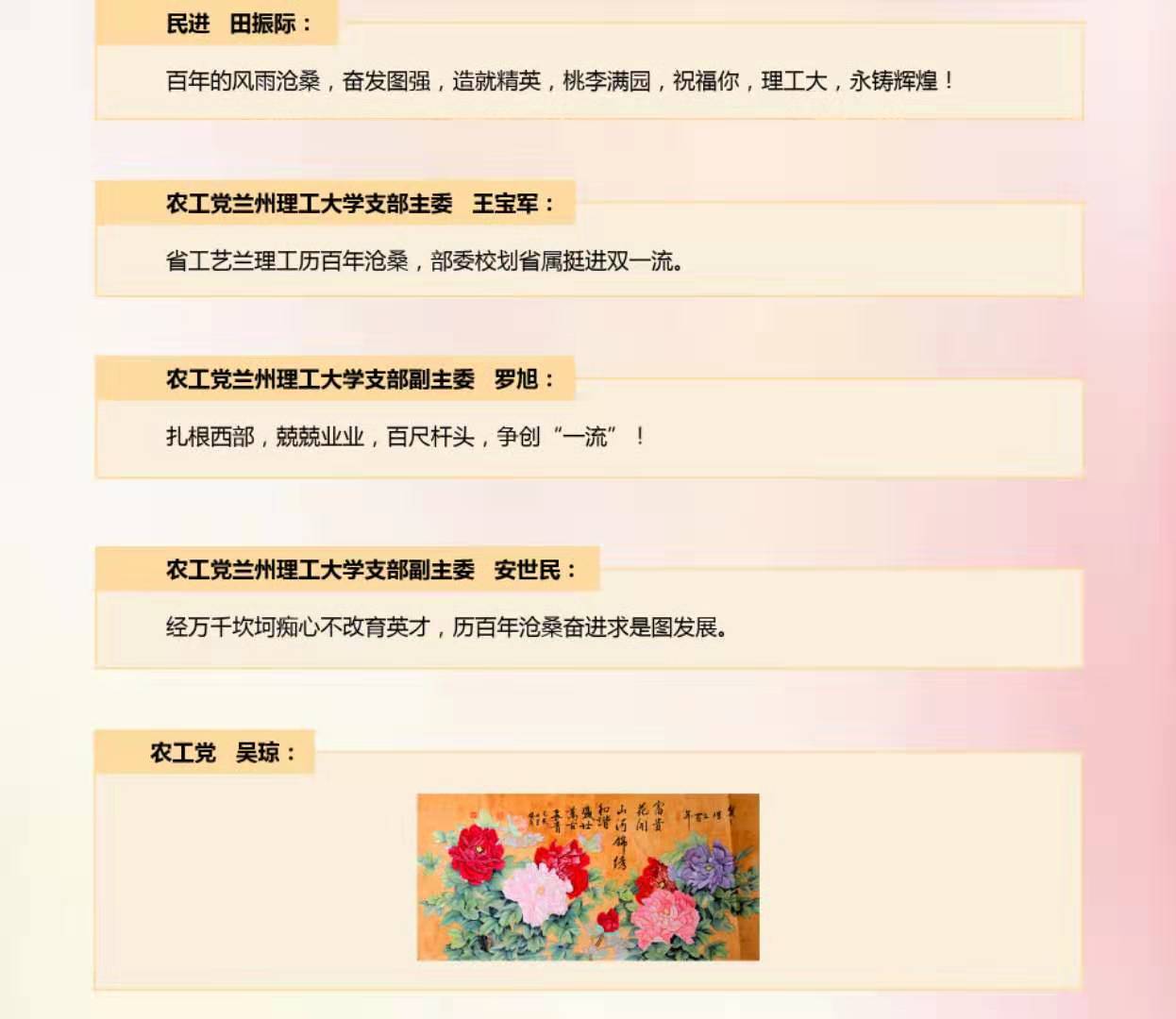 為了慶祝新中國成立70周年和學校百年華誕,學校黨外知識分子通過各種方式抒發對祖國、對母校的感恩和熱愛之情,熱情謳歌黨的領導、禮贊祖國、致敬母校,充分反映出統一戰線成員心系祖國、關心學校的真摯情感,展現了奮進新時代、共筑中國夢的熱切心愿,大家表示將不忘合作初心、把愛國愛校之情轉化為努力奮斗、建功立業新時代的實際行動,繼續攜手前進,共同為學校“雙一流”建設和幸福美好新甘肅貢獻才智和力量。