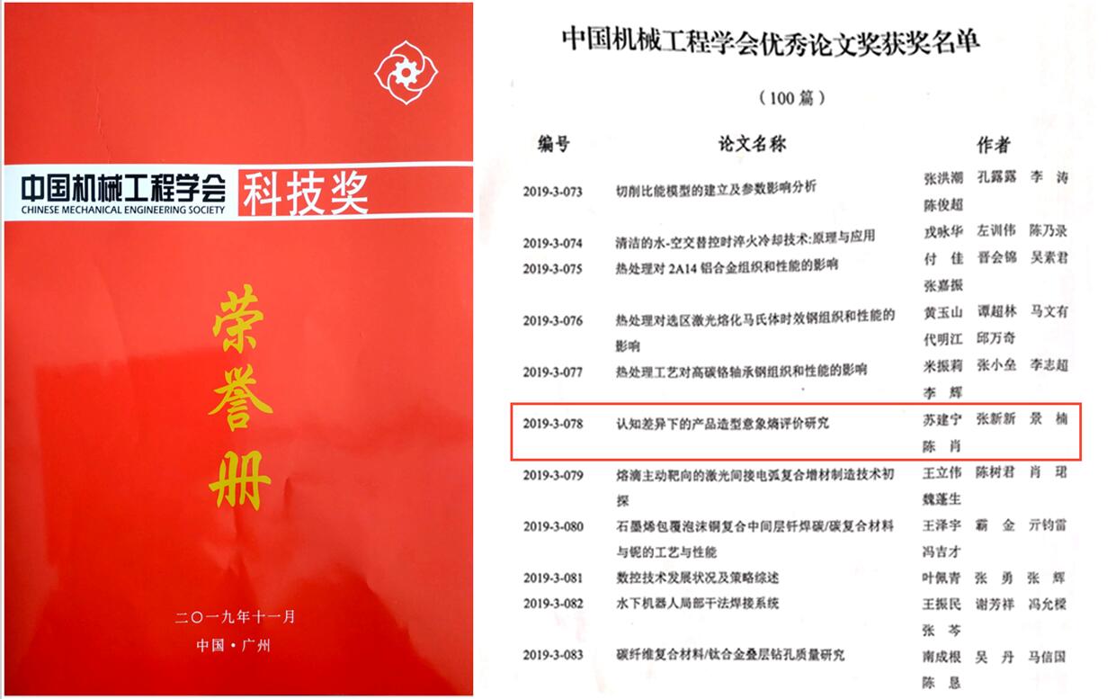 11月10日,2019年度中國機械工程學會年會在廣州開幕,會上對2019年度中國機械工程學會科技獎獲得者和獲獎成果進行了表彰。學校設計藝術學院蘇建寧教授于在《機械設計》期刊發表的論文“認知差異下產品造型意象熵研究”,榮獲2019年度中國機械工程學會優秀論文獎(top100篇),這是《機械設計》期刊工業設計欄目中的文章首次獲得該獎。