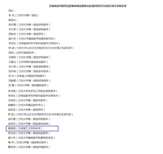 為了攻克新冠病毒科技難題,打贏疫情防控阻擊戰,甘肅省科技廳啟動了“新型冠狀病毒感染的肺炎疫情科研攻關特別專項”,學校重點實驗室青年科研骨干姜麗麗副教授入選了特別專項專家組,并作為項目負責人,主持“新冠病毒疫情的消毒與廢物處理”攻關項目的組織與實施。