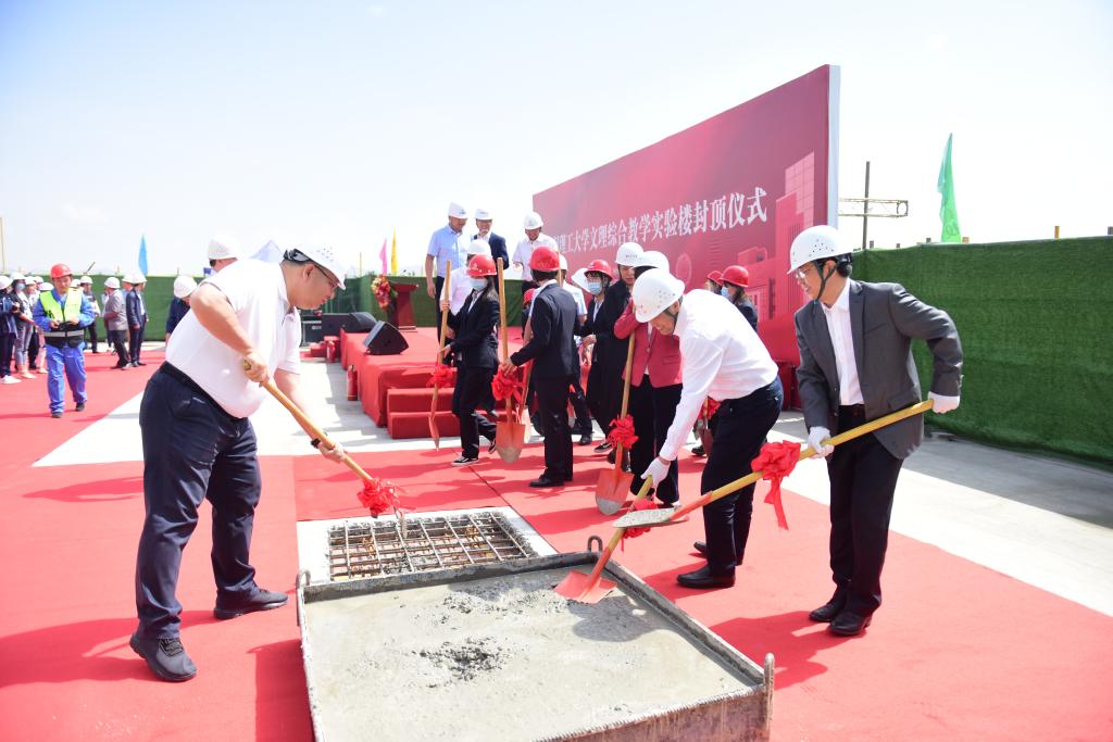 參加儀式的領導和來賓為文理綜合教學實驗樓封頂,共同見證工程建設的階段性成果。