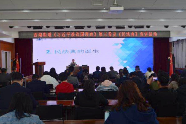 為深入學習貫徹習近平新時代中國特色社會主義思想,加強街道社區與轄區人大代表、政協委員、轄區單位間的互聯互動,進一步凝聚基層民主協商共識,夯實城市基層黨建基礎。10月16日,七里河區西湖街道黨工委精心組織,召開理論宣講活動,邀請蘭州理工大學講師團講授《習近平談治國理政》第三卷及《民法典》知識,街道人大代表、政協委員、轄區單位黨組織負責人及街道班子成員、各社區黨組織負責人、街道機關干部、社區黨建專干共120余人參加了活動。