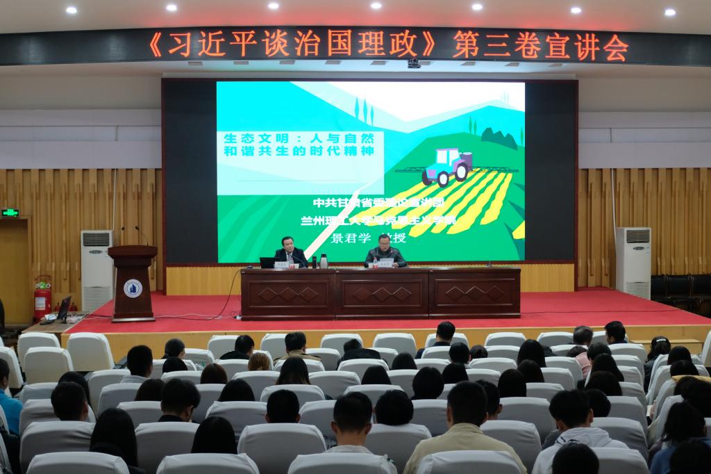 10月20日下午,學(xué)校在蘭工坪校區(qū)逸夫科技館大報(bào)告廳舉辦《習(xí)近平談治國(guó)理政》第三卷宣講報(bào)告會(huì),邀請(qǐng)中共甘肅省委理論宣講團(tuán)成員、我校馬克思主義學(xué)院教授景君學(xué)作宣講報(bào)告。學(xué)校部分中干,黨委宣傳部、馬克思主義學(xué)院、能動(dòng)學(xué)院、生命學(xué)院、法學(xué)院等單位的師生代表聆聽(tīng)報(bào)告,學(xué)校副校長(zhǎng)王全進(jìn)主持報(bào)告會(huì)。