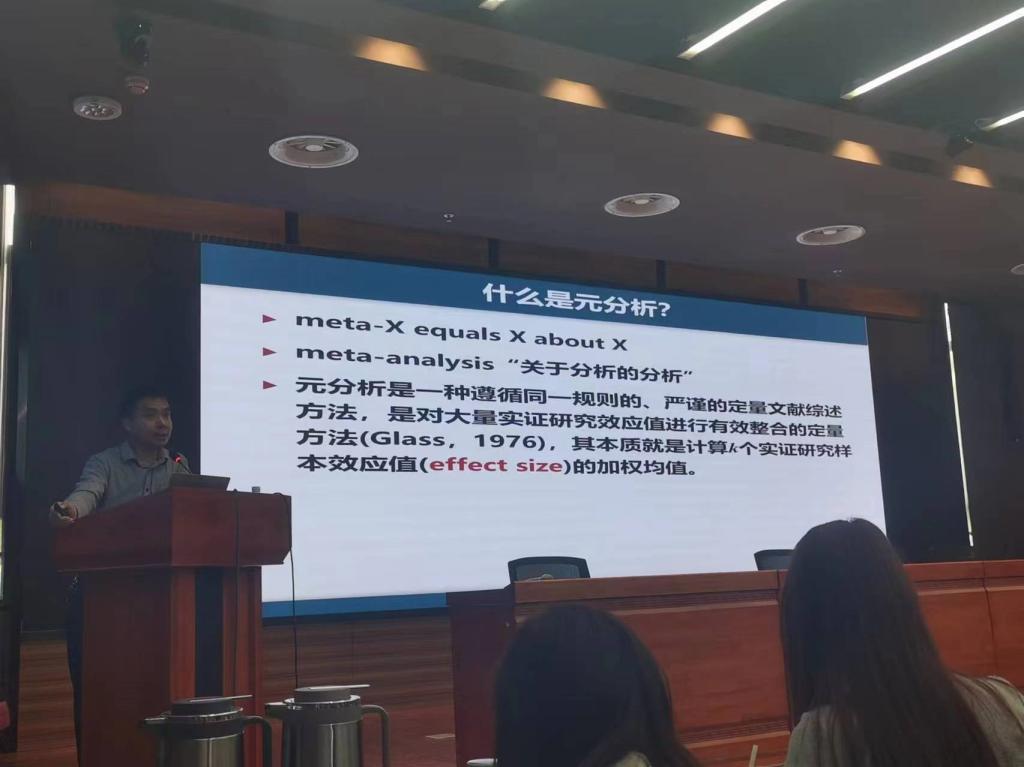 衛旭華教授就研究領域中重要的研究工具—元分析方法展開本次報告內容,分別從多變量關系元分析、中介效應的元分析、中介調節混合分析、元分析的創新路徑四個方面對元分析的概念、基本原理和國內外研究現狀進行了詳細充分的介紹。衛教授的報告結合數據,貼近現實,通俗易懂,使同學們對復雜的元分析方法有了更深的認識與理解。最后,衛教授以自身經歷分享了做元分析研究的注意事項,同學們受益匪淺。