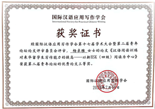 大會圍繞“紀(jì)念國際漢語應(yīng)用寫作學(xué)會發(fā)起30周年·傳承發(fā)展?jié)h語應(yīng)用寫作理論與教學(xué)研究”這一主題,通過專題講座、分組研討、代表發(fā)言等多種形式,共同探討漢語應(yīng)用寫作如何緊密結(jié)合新時代社會發(fā)展需求、主動融入國家新發(fā)展理念、推動學(xué)科創(chuàng)新發(fā)展。我校文學(xué)院在讀研究生楊卓雅、趙蓓、ATAYEV KERIM(柯林頓)參加本次會議,并作了相關(guān)論文報告,獲得“國際漢語應(yīng)用寫作學(xué)會第二屆青年論壇優(yōu)秀論文三等獎”。