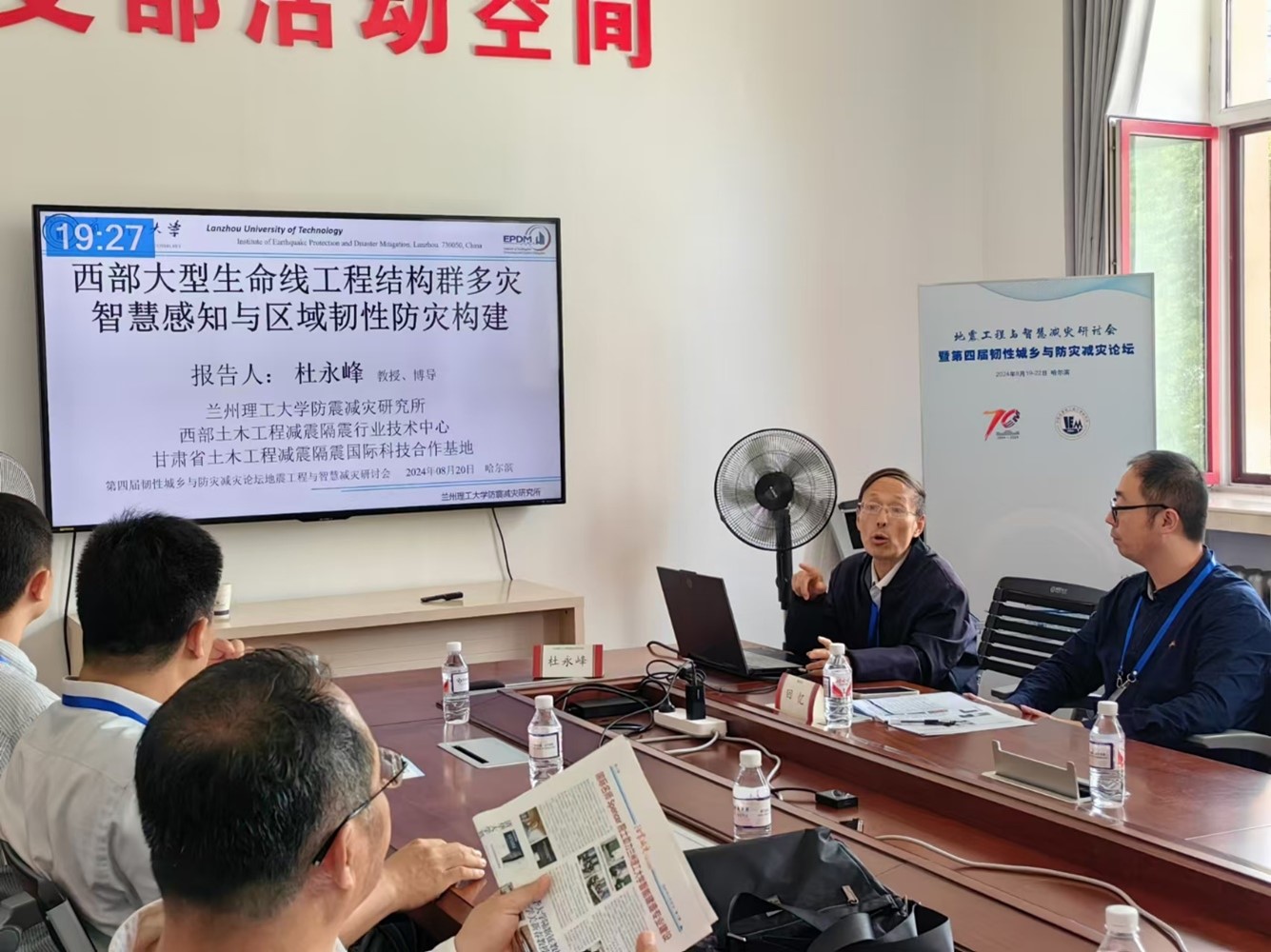 8月20日下午,杜永峰教授做了題為“西部大型生命線工程結構群多災智慧感知與區域韌性防災構建”的分會場報告,并擔任分會主持人。杜永峰教授的報告介紹了甘肅積石山6.2級地震、新疆烏什7.1級地震等幾場西部地區強震的抗震韌性,介紹了團隊承擔的西部地區大型隔震機場及非隔震機場、隔震學校、隔震醫院及隔震住宅群的地震災害及溫度監測,支護結構、文物結構及造像三維重構,西部公路橋梁群風振、地震和交通超載的智慧監測及區域韌性和西部風電塔群風振、地震災害監測,大型儲油罐隔震等特色問題,與兄弟院校的研究學者交流蘭州理工大學防震減災研究團隊有關區域韌性防災系統建設的探索。