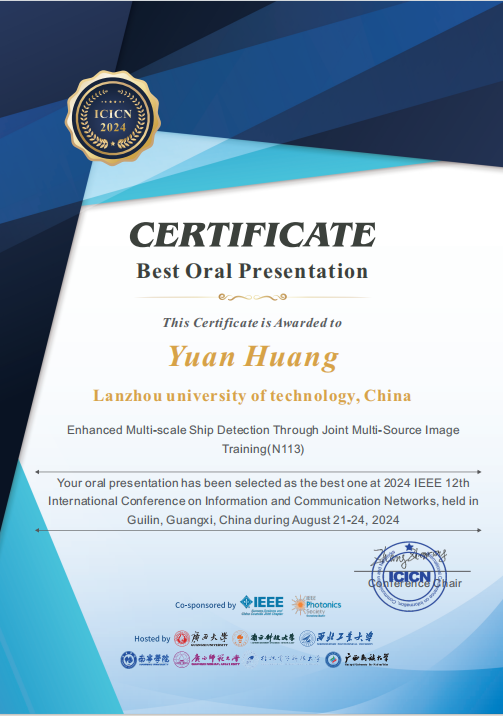 在本次會議上,計通學院碩士生周根學、黃媛和張凌雲分別作了分會報告,石樂太同學進行了海報展示。周根學的報告題為《Integrated Design of OFDM-LFM Lidar Communication in IoV Environment》,黃媛的報告題為《Multi-scale Ship Detection Through Joint Multi-Source Image Training》,張凌雲的報告題為《Compressed Sensing Optimized OFDM-IM Lidar-Communication Integrated System》,石樂太的報告題目為《Dynamic Displacement Response TCN-BiGRU Prediction of Isolation Bearings》。值得一提的是,黃媛同學因其出色的報告獲得了“最佳學生報告獎”。