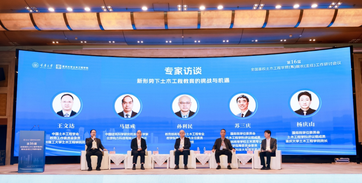 10月18日至20日,由中國土木工程學會教育工作委員會、教育部高等學校土木工程專業教學指導分委員會主辦,重慶大學承辦的第十六屆全國高校土木工程學院(系)院長(主任)工作研討會議在重慶舉行,來自全國200多所高校的700多名代表參加會議。會議聚焦“新形勢下土木工程教育的挑戰與機遇”為主題開展研討。我校土木工程學院負責人作為教育工作委員會委員參會,在會議專門組織的兩場專家訪談中,王文達與訪談專家共同對各院校當前人才培養、招生就業、工作考核等問題進行了交流。