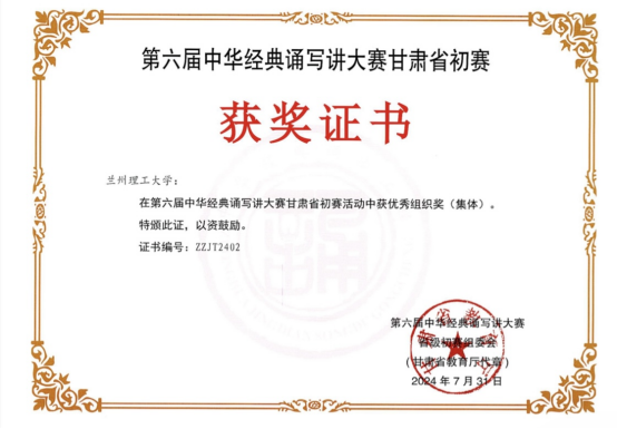 在學校領導和校語委的鼎力支持下,蘭州理工大學文學院在第六屆中華經典誦寫講大賽中取得了優異成績,榮獲“第六屆中華經典誦寫講大賽省級優秀組織(集體)獎”。充分展示了師生深厚的文化素養和卓越的藝術表現力。