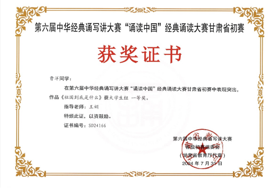 在本次大賽中,文學院師生同心協力,碩果累累,共獲得一等獎1名,三等獎4名,優秀獎2名,優秀指導教師1名。由王娟老師指導的曹陽同學,憑借作品《祖國到底是什么》榮獲省級大學生組一等獎,并斬獲全國大學生組優秀獎。王娟老師個人榮獲“優秀指導教師獎”。獲獎選手深刻詮釋了作品的內涵,打動了評委和觀眾,彰顯了文學院在學生培養方面的卓越成果。