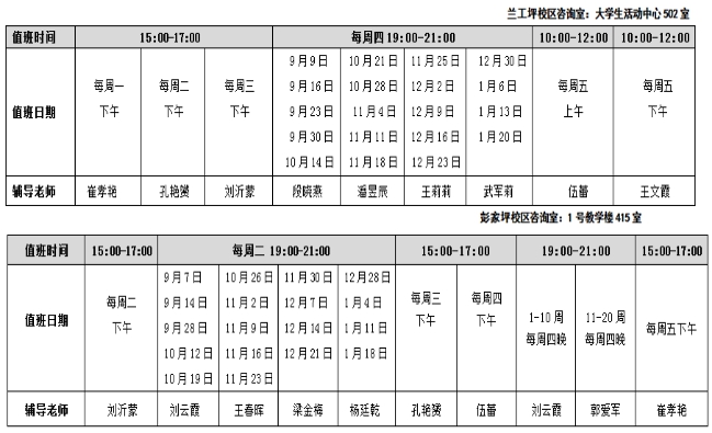 為了更好地滿足我校師生對心理咨詢服務的需求,學校心理健康指導服務中心在2021年秋季學期繼續開通校醫合作綠色通道,蘭州市第三人民醫院3名精神科醫生將每月來我校心理健康中心坐診,開展心理健康篩查、評估與診療工作。九月份坐診安排如下: