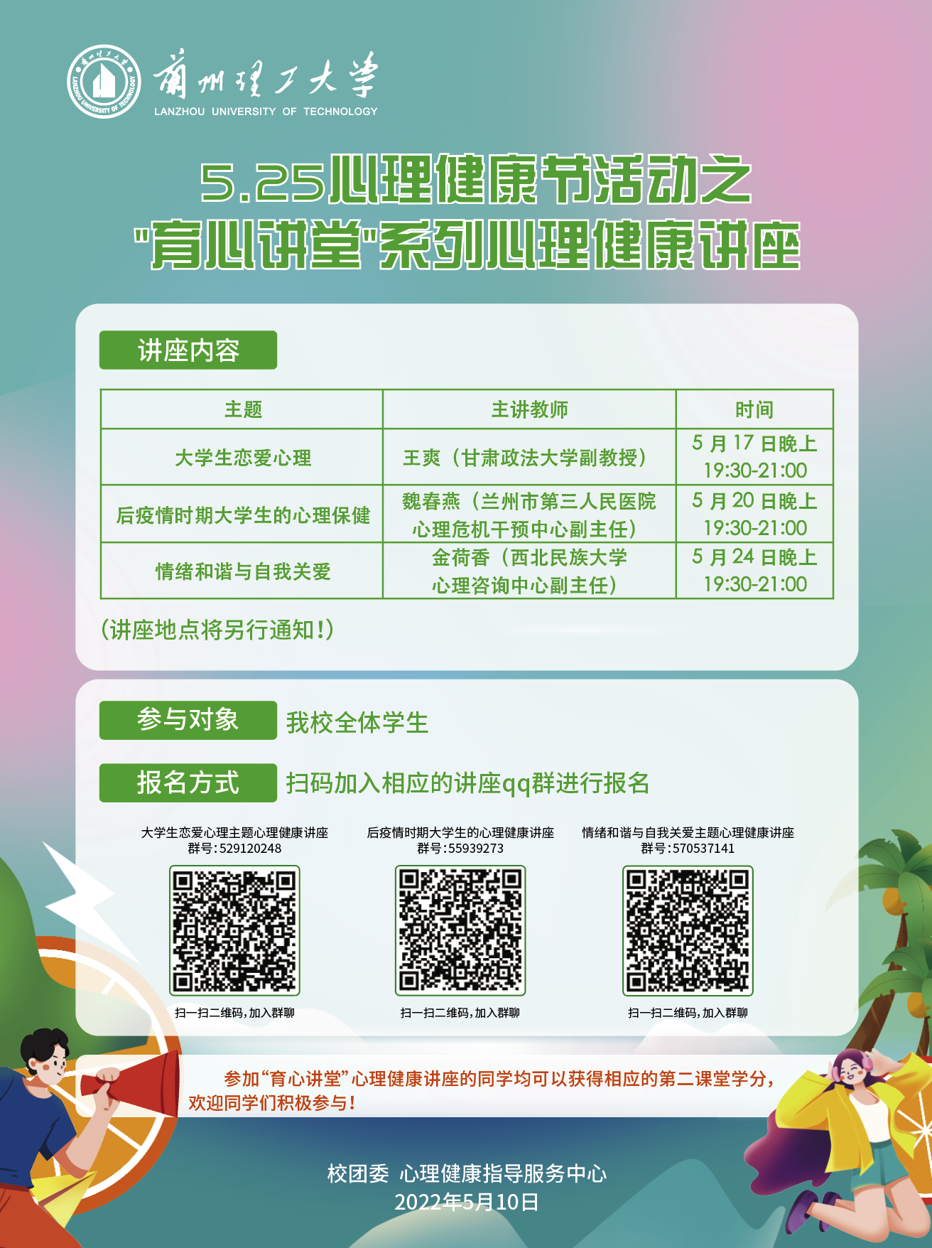 為貫徹落實《高校思想政治工作質(zhì)量提升工程實施綱要》和《高等學(xué)校學(xué)生心理健康教育指導(dǎo)綱要》等文件精神,堅持育心與育德相結(jié)合,進(jìn)一步推動我校心理育人工作落實落細(xì),在第十九屆“5.25”心理健康節(jié)期間,校團(tuán)委、心理健康指導(dǎo)服務(wù)中心邀請到三位省內(nèi)知名心理健康教育領(lǐng)域的專家學(xué)者為我校學(xué)生普及心理健康知識和理念,引導(dǎo)同學(xué)們更好地接納自我,發(fā)展自我,具體內(nèi)容安排如下: