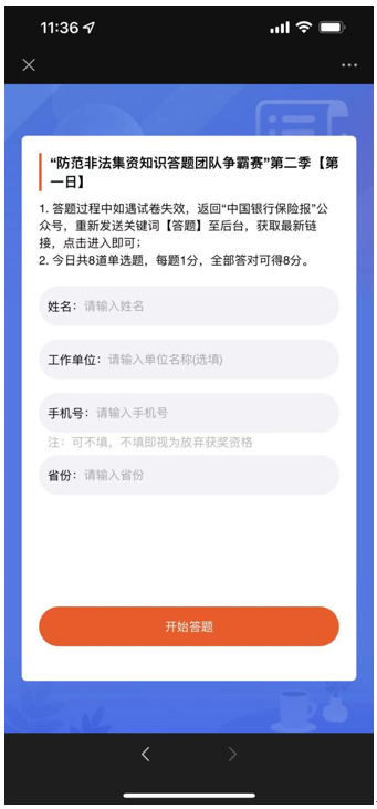 (三)進入活動頁面后,輸入姓名并選擇所在地區(省、自治區、直轄市、新疆生產建設兵團,不含港澳臺地區),輸入手機號(僅用于統計分數時識別身份,不會 外泄)和工作單位(選填)后,即可開始答題。
