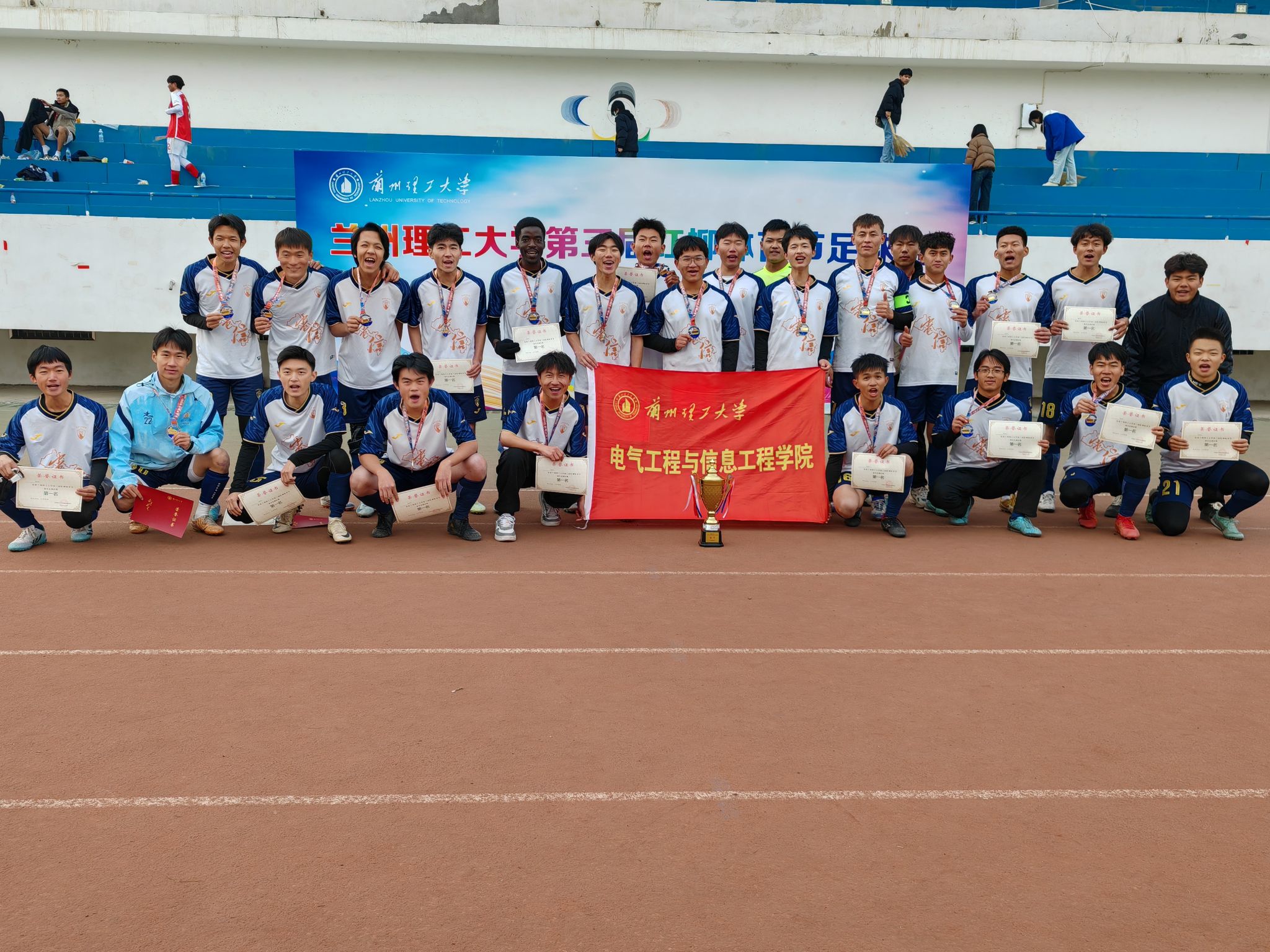 為引導大學生在體育鍛煉中享受樂趣、增強體質、錘煉意志,鼓勵大學生走下網絡,走出宿舍,推進陽光體育運動,豐富校園文化生活,電信學院組織足球隊、乒乓球隊等多支隊伍參加蘭州理工大學第三屆紅柳體育節。11月19日下午,在第三屆紅柳體育節足球決賽中,經過認真備戰、頑強拼搏、精心布置戰術打法,電信學院學生男子足球隊憑借卓越的團隊精神、不懈的努力與精準的策略布局,在決賽中以3:2的比分獲勝,成功奪得冠軍。
