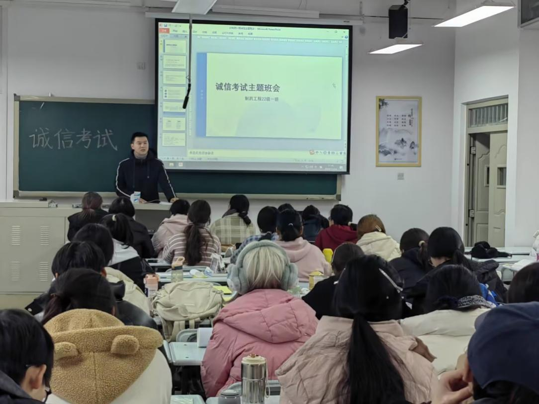 在期末考試臨近之際,為嚴(yán)格考風(fēng)考紀(jì),生命科學(xué)與工程學(xué)院2022級制藥工程一班于12月24日下午在彭家坪校區(qū)蔚云樓510教室舉辦了“誠信考試”主題班會。