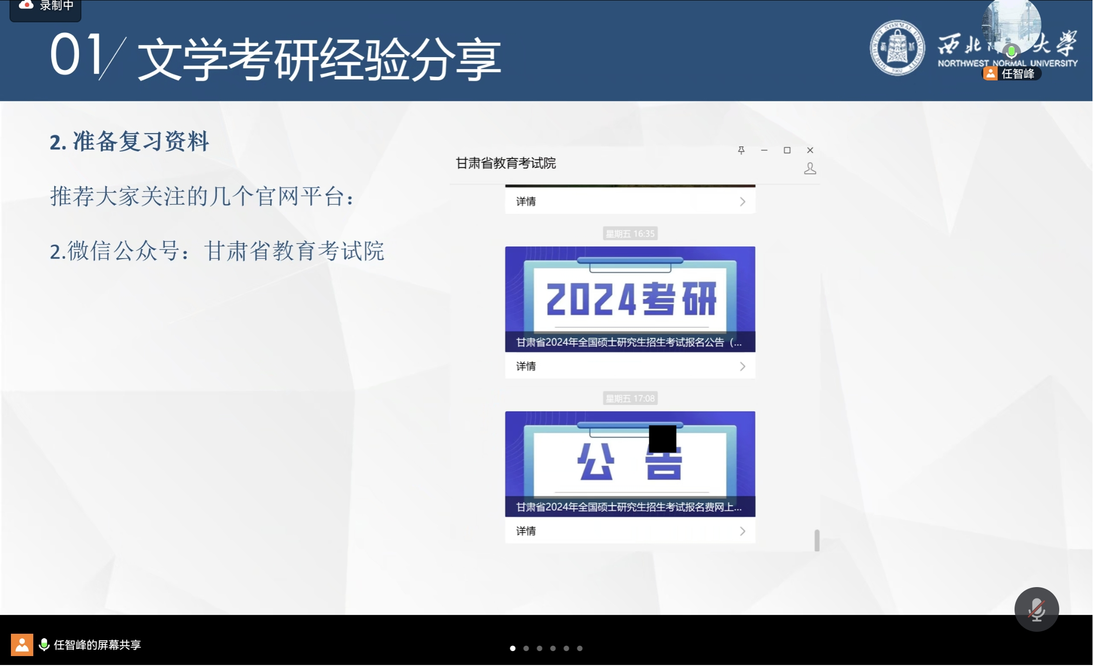 本次交流會以考研為切入點,任智峰以西北師大學(xué)漢語言文學(xué)考研為例,從考研目的切入,圍繞擇校、復(fù)習(xí)資料準(zhǔn)備,復(fù)習(xí)規(guī)劃,考試時間等方面進行分享;閆哲結(jié)合個人考研經(jīng)驗,分享現(xiàn)當(dāng)代文學(xué)方向?qū)I(yè)課復(fù)習(xí);楊竣茗對語言學(xué)與應(yīng)用語言學(xué)方向進行了分享;楊陽對對外漢語專業(yè)方向的復(fù)習(xí)經(jīng)驗、英語、政治、專業(yè)課以及面試等方面內(nèi)容進行分享;李佳欣圍繞古代文學(xué)方向,專業(yè)課復(fù)習(xí),英語復(fù)習(xí),求職就業(yè)等方面進行經(jīng)驗分享。