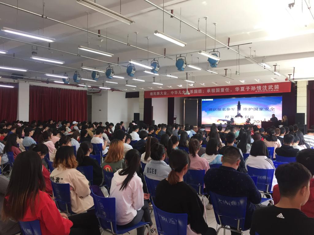 會上,李部長從鴉片戰爭講到釣魚島紛爭,從海外戰爭談到國內軍事,圍繞國家利益、和平與發展、國家安全和征兵入伍政策等方面,與同學們進行交流,講解內容豐富,報告形式生動;隨后,李部長鼓勵當代青年應當勇于擔當,主動承擔起保家衛國的神圣職責;最后,他介紹了2018年學校征兵情況,強調大學生入伍對于自身塑造和鍛煉成才具有重要意義,并希望同學們積極響應、協調做好2019年征兵工作。