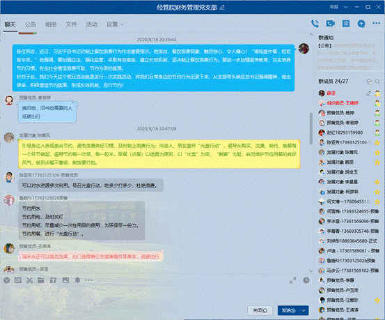 本次活動效果顯著,大家積極發言,從引導身邊人養成崇尚節約、避免浪費的良好習慣,及時制止浪費行為,到向親人、朋友宣傳“光盤行動”,倡導從購買、洗摘、制作、就餐每一個環節做起,從節約一滴水、一度電,到節能減排,低碳出行,環保出行,黨員紛紛表示要從自身做起,將節約的習慣與氛圍積極擴散出去。