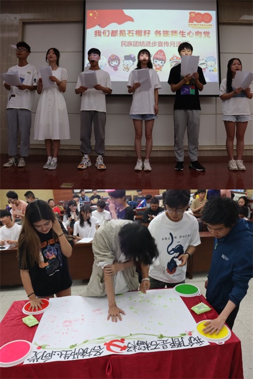 活動(dòng)現(xiàn)場,范夢琦等六位同學(xué)為大家?guī)砹死收b《民族團(tuán)結(jié)之歌》,這是各民族心與心的橋梁,是通往和諧的一首贊歌。高沙爾、麥合麗婭等七位少數(shù)民族同學(xué)專門為今天的活動(dòng)錄制了視頻,介紹自己的民族,介紹自己的家鄉(xiāng),再一次拉近了彼此之間的距離。現(xiàn)場還展列了由各民族同學(xué)提供顯示家鄉(xiāng)變化的照片,大家紛紛表示在中國共產(chǎn)黨的正確領(lǐng)導(dǎo)下,我國少數(shù)民族的面貌、民族地區(qū)的面貌、民族關(guān)系的面貌、中華民族的面貌都發(fā)生了翻天覆地的歷史性巨變。活動(dòng)的最后,各民族同學(xué)上臺(tái)一同在海報(bào)紙上摁上了自己的手印,寓意各民族手拉手,心連心,中華民族一家親,同心共筑中國夢。