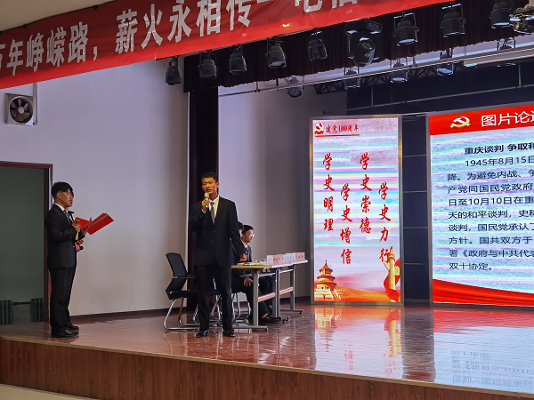 共有九支隊伍參加復賽。本次復賽,設置“選擇題、論述題”兩個環節。內容以黨史為主體,涉及知識面廣、趣味性強。選擇題階段各參賽隊伍充分展示了對黨史知識的扎實學習。論述題階段分為圖片題和視頻題,面對隨機給出的黨史圖片與視頻,選手們思考片刻后便進行了飽含深情的講述,表達了自己對黨史的深刻認識與理解。參賽選手們精神飽滿、沉著應對、積極作答,展現了扎實的黨史知識儲備、過硬的心理素質、融洽的團隊協作。