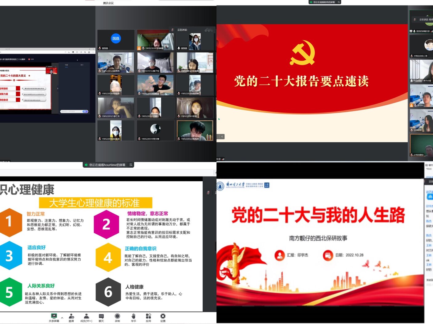 輔導員通過QQ、微信等新媒體,及時發布防控指南、服務提示,召開主題班會,寫明講清防控政策,引導學生理解防疫要求、支持防控安排。針對心理健康困惑學生、被隔離轉運的同學,嚴格落實“一對一”聯系制度,精準掌握學生健康狀況,動態完善重點關注學生信息臺賬。先后組織開展“凝心聚力,共克時艱”線上主題班會以及班委會、宿舍長會等,通過聊天、談心等方式,為學生講解當前疫情防控形勢、疫情防護注意事項、教育學生切實做到不信謠、不造謠、不傳謠,嚴格遵守各項紀律和疫情防控要求,積極響應“請黨放心 強國有我”號召,做防疫政策宣傳者、遵規守紀踐行者、校園陣地守護者。