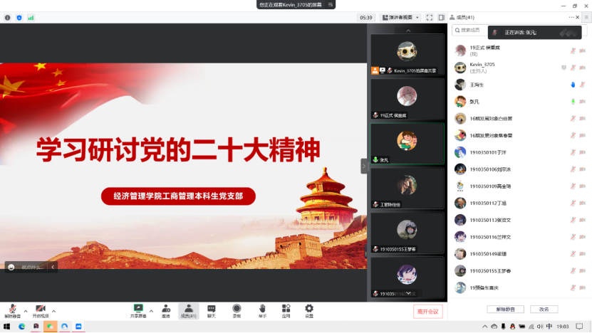 為深入貫徹落實《經濟管理學院黨委理論學習中心組專題學習黨的二十大精神工作方案》要求,充分認識黨的二十大的重大意義和全面深刻領會黨的二十大精神,經濟管理學院工商管理本科生黨支部于11月14日晚通過騰訊會議召開“黨的二十大精神專題學習研討會”,會議由支部書記張凡主持,支部所有黨員及部分積極分子參加并分享交流學習心得。
