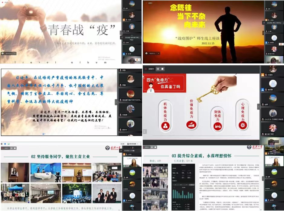 為進一步引導學生更加有效地調整心理狀態、提高學習效率、理清科研思路,11月15日晚,生命戰“疫”圍爐之二“疫情期間心理調適與健康成長”在云端溫暖分享。本次“圍爐”特邀武漢大學生命科學學院2020級博士研究生汪可馨(我校生命科學與工程學院2018屆推免碩博連讀生)、學院近年來引進的田輝、潘立超兩位博士,張丙云副教授做了交流。會議由生命科學與工程學院副院長任海偉教授主持。學院李志忠教授和部分教師、本科生和研究生150人參加騰訊會議。