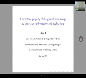 張志濤研究員、代國偉教授及姬超副教授分別做了題為《Some new results on the Chern-Simons-Schrodinger system》、《Bifurcation theory of nonlinear operator equations and its applications》、《A monotone property of the ground state energy to the scalar field equation and applications》的精彩學術報告。報告結束后,三位報告人詳細解答了師生提出的相關問題,并且就疫情形式下的教學與科研展開了探討與交流。通過此次學習交流,一方面讓相關研究生了解了當前的學術前沿及熱點,同時也加強了與同行之間的學術交流。(撰稿人:關雯, 終審人:劉全恩)