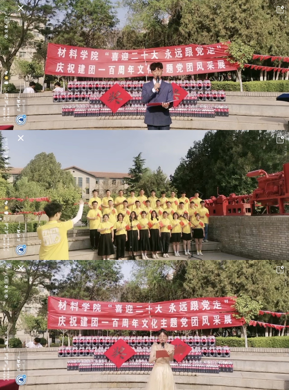 為迎接黨的二十大勝利召開,在“五四”青年節前后,營造熱烈慶祝建團100周年的校園文化氛圍,提升學院基層黨、團支部的凝聚力和創造力,展示青年青春的活力與風采,材料學院團委于2022年5月7日下午在蘭州理工大學蘭工坪校區萃英廣場開展“喜迎二十大 永遠跟黨走”慶祝建團一百周年文化主題黨、團支部風采展,活動全程由蘭州理工大學官方微博線上直播。蘭州理工大學黨委學生工作部部長孫偉國、校團委副書記張曉鋒、材料學院黨委副書記王祎敏蒞臨活動現場,學院全體輔導員及部分學生參與活動。