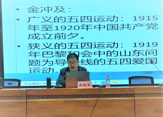 吳曉軍老師以《弘揚五四精神,實現民族復興》為主題,從五四運動的原因、五四運動的功績、五四精神的價值、新時代青年運動的方向和青年的使命等四個方面為同學們展開系統講述。通過列舉瞿秋白、毛澤東、中國學術界等對五四精神的重視與研究,闡明五四精神的時代內涵,揭示中國青年運動永久奮斗的偉大傳統。吳老師結合習近平總書記在紀念五四運動100周年大會對青年提出的六點希望,指出新時代青年要志存高遠激發奮進潛力,熱愛祖國增強立身之本,勇擔重任服務民族振興,接續奮斗爭做時代先鋒,苦練本領增長自身才干,修身立德打牢道德根基。