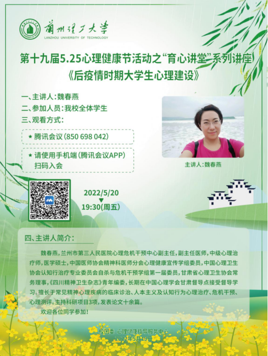 魏春燕,蘭州市第三人民醫院心理危機干預中心副主任,副主任醫師,中級心理治療師,醫學碩士,中國醫師協會精神科醫師分會心理健康宣傳學組委員,中國心理衛生協會認知行治療專業委員會自殺與危機干預學組第一屆委員,甘肅省心理衛生協會常務理事,《四川精神衛生雜志》青年編委,長期在中國心理學會甘肅督導點接受督導學習。擅長于常見精神心理疾病的臨床診治、人本主義及認知行為心理治療、危機干預、心理測評。主持科研項目3項,發表論文十余篇。