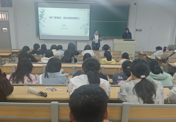 2024年9月20日下午,文學院舉辦以“推廣普通話,強化民族凝聚力”為主題的推廣普通話活動周專題講座,邀請蘭州城市學院副教授,國家級普通話水平測試員,甘肅省語言文字工作專家咨詢委員會委員任麗花老師主講,文學院副院長錢得運主持,2024級漢語言文學專業全體本科生和2023級漢語國際教育專業碩士生參加。