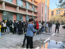 演練開始前,由專業消防工作人員對學生進行消防安全培訓,重點介紹了各類滅火器材的名稱、用法,強調了有關火災現場的應急處置方法及使用滅火器的注意事項。同時,講解了消火栓、消防水帶的使用方法,并進行現場示范,讓同學們親自體驗了消火栓連接水帶的出水過程。