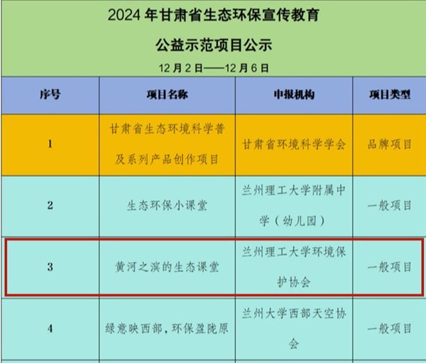 近日,甘肅省生態環境廳公示了2024年甘肅省生態環保宣傳教育公益示范項目名單,蘭州理工大學環境保護協會“黃河之濱的生態課堂”項目成功入選。