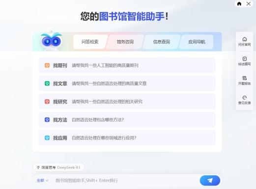 校內(nèi)師生可通過智慧圖書館網(wǎng)站首頁或微信公眾號等渠道使用AI智能館員服務(wù),可選擇是否使用DeepSeek-R1大模型。首次上線的AI智能館員可實(shí)現(xiàn)館務(wù)咨詢、知識問答、智能檢索、文獻(xiàn)保障、文獻(xiàn)綜述、信息查詢、文獻(xiàn)研讀等多種實(shí)用功能,集成大模型后,系統(tǒng)具備了較強(qiáng)的問題拆解能力和數(shù)據(jù)分析能力,回答問題更智能,系統(tǒng)具備更強(qiáng)大的語義理解和信息檢索能力,能夠更準(zhǔn)確理解師生需求,提供精準(zhǔn)的知識服務(wù)。