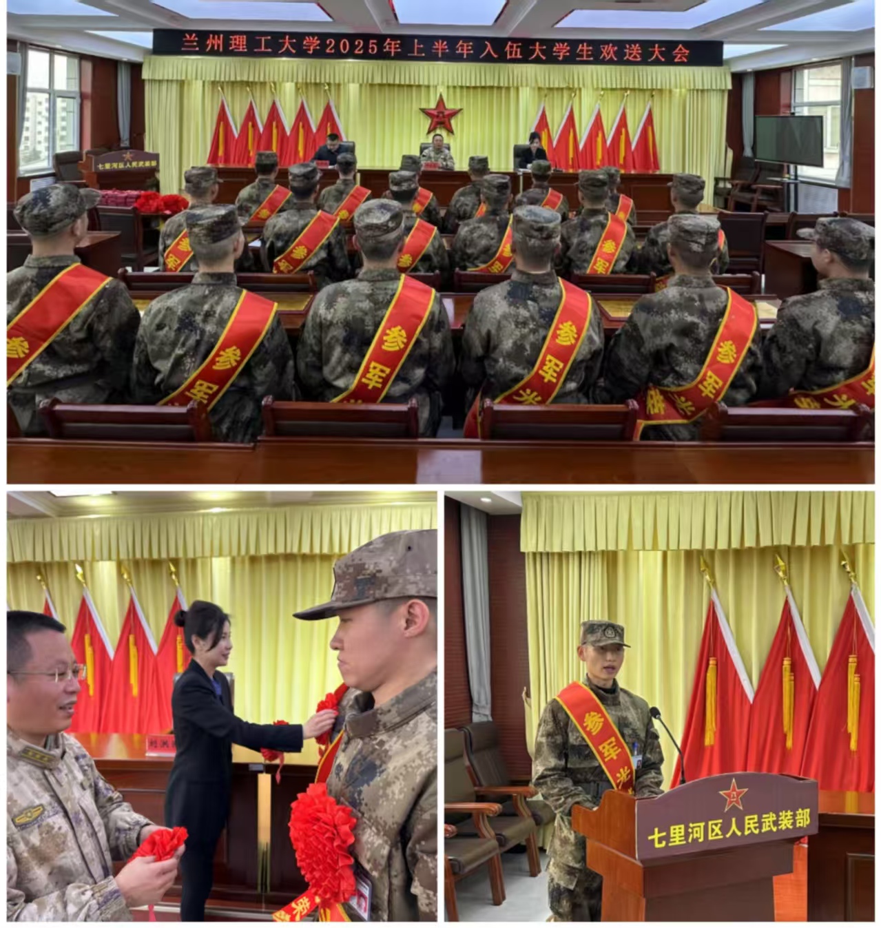 七里河區(qū)人民武裝部上校政委師衛(wèi)東表示,同學們能夠積極響應祖國號召,把愛國之心轉化為報國之行的熱情值得肯定,希望蘭理工學子能夠把個人理想同祖國需要、社會發(fā)展緊密聯(lián)系在一起,把個人追求融入中國夢、強軍夢,投身強軍興軍的偉大實踐。黨委學生工作部部長張艷指出,征兵工作是強國建設、強軍事業(yè)的關鍵一環(huán),意義重大,希望新兵牢記母校教導、傳承好紅柳精神,以實際行動彰顯高度的思想政治覺悟和深沉熾熱的愛國情懷,在綠色軍營樹理想、保家國、勤歷練、當標桿。畢業(yè)生尚偉作為代表發(fā)言,表達了不怕吃苦、不怕困難、敢于擔當、保家衛(wèi)國的決心,在軍營里努力學習科學知識和軍事技能,提高身體素質,努力成長為有靈魂、有本事、有血性、有品德的新一代革命軍人,在把人民軍隊建設成為世界一流軍隊的歷史洪流中貢獻自己的力量。與會其他新兵也紛紛表示,到部隊后一定努力學習、刻苦訓練,立志在軍營建功立業(yè)。
