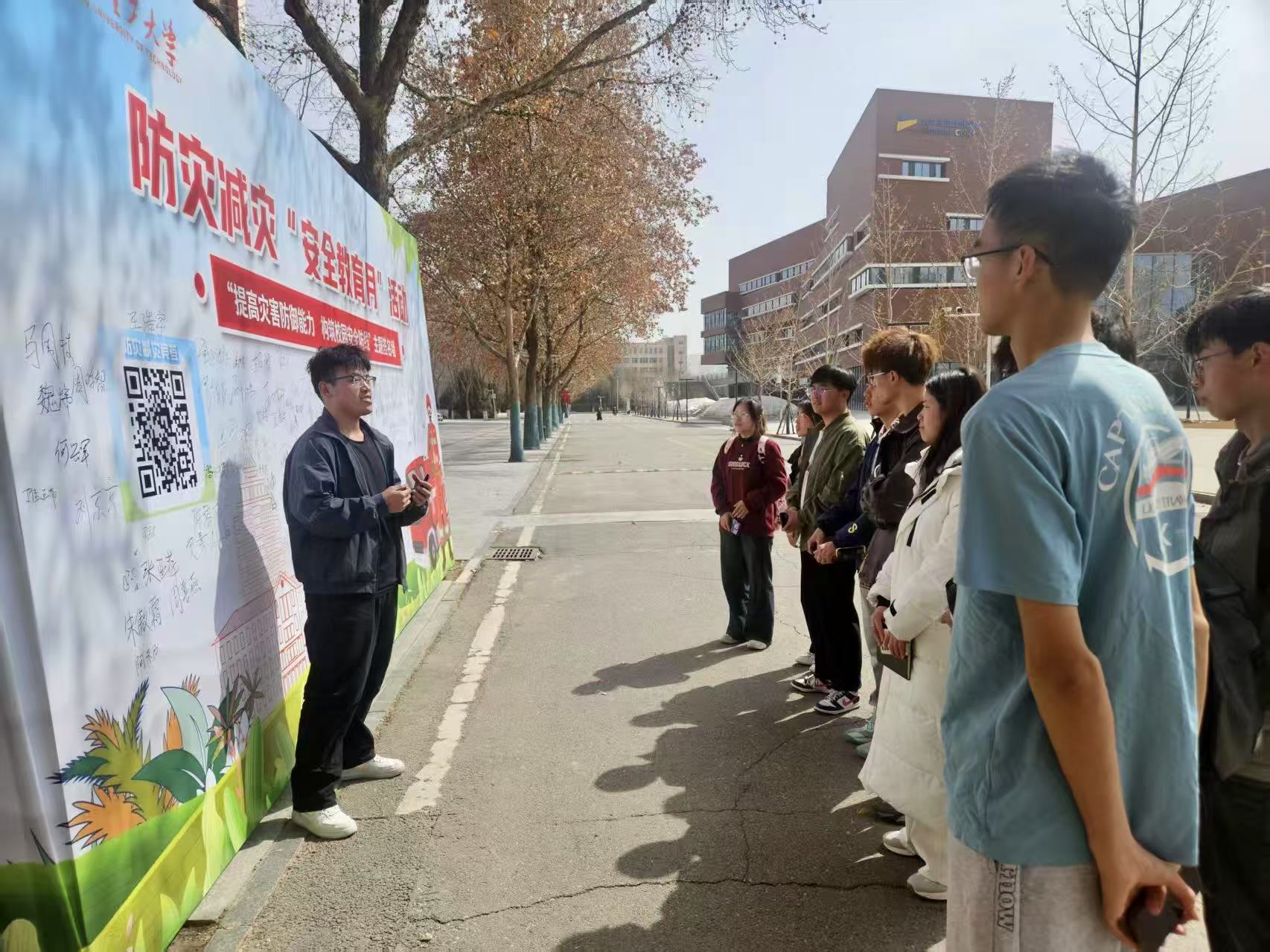宣講環(huán)節(jié),土木工程學(xué)院宣講員結(jié)合自身知識(shí)儲(chǔ)備和志愿者經(jīng)歷,為同學(xué)們細(xì)致講解了學(xué)習(xí)生活里的安全隱患,并生動(dòng)演示地震、火災(zāi)等緊急狀況下的應(yīng)急處理方法?,F(xiàn)場(chǎng)還設(shè)置線上競(jìng)答二維碼,學(xué)生用手機(jī)掃碼即可參與涵蓋地震、火災(zāi)、氣象災(zāi)害、交通安全等多領(lǐng)域的知識(shí)競(jìng)賽,進(jìn)一步夯實(shí)所學(xué)知識(shí)。最后同學(xué)們?cè)凇疤嵘秊?zāi)害防御能力,構(gòu)筑校園安全防線”的簽名墻上簽名,表達(dá)對(duì)防災(zāi)減災(zāi)工作的關(guān)注與對(duì)校園安全的支持。