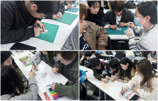在“青言青語講理論”環節,團支書結合廣大同學的學習生活實際,重點講解學習了“體質強健計劃”“美育浸潤行動”等重要內容,以青年視角、青年聲音、青年風采學習領會學校黨代會精神,增強團員青年的責任感與使命感。在藝術創作環節,同學們運用專業特長,將“數智校園建設”“美麗校園行動”等學校第四次黨代會確定的發展藍圖轉化為藝術語言,現場創作手繪與剪紙作品,生動展現青年視角中的黨代會精神。