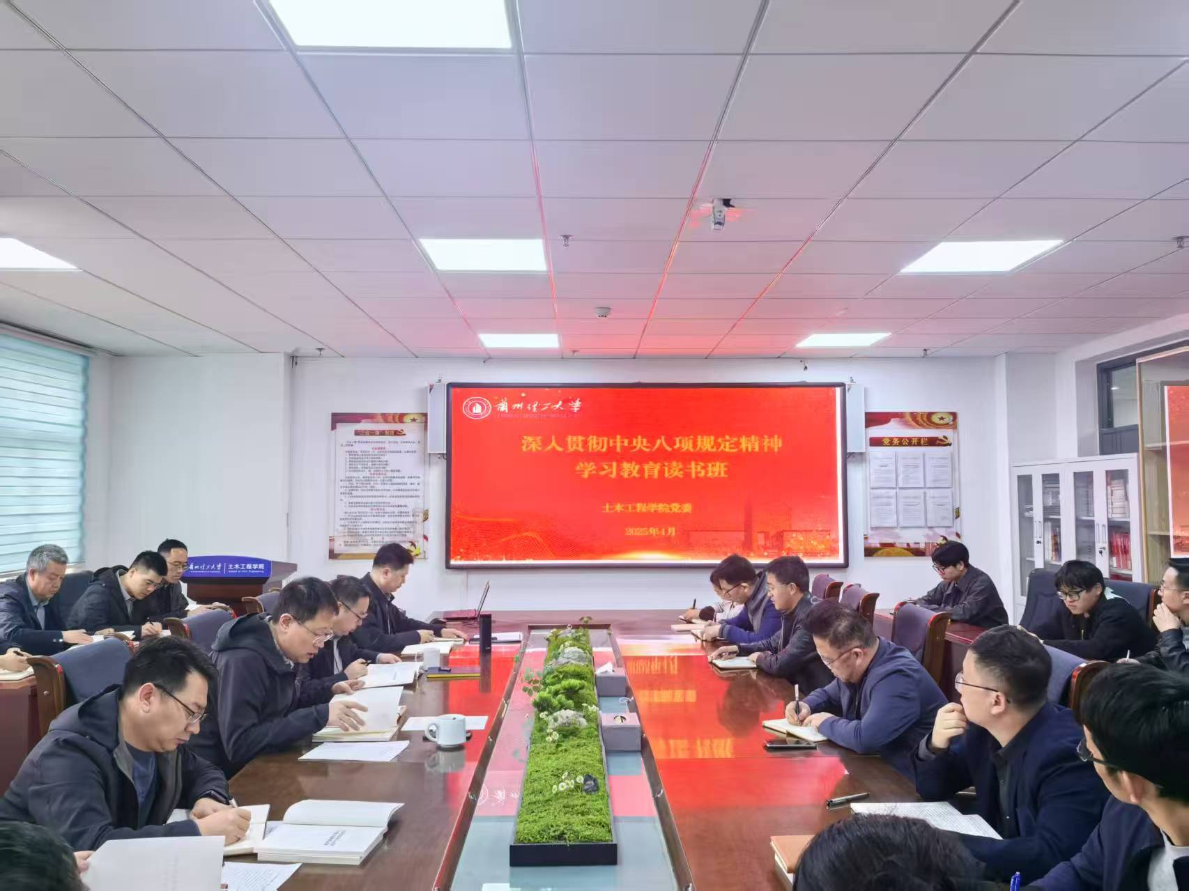 按照深入貫徹中央八項規定精神學習教育部署,4月11日,土木工程學院在蘭工坪校區綜合實驗大樓4樓黨建活動室開展深入貫徹中央八項規定精神學習教育讀書班集中學習活動,學院領導班子成員、黨委委員、各黨支部書記參加會議。