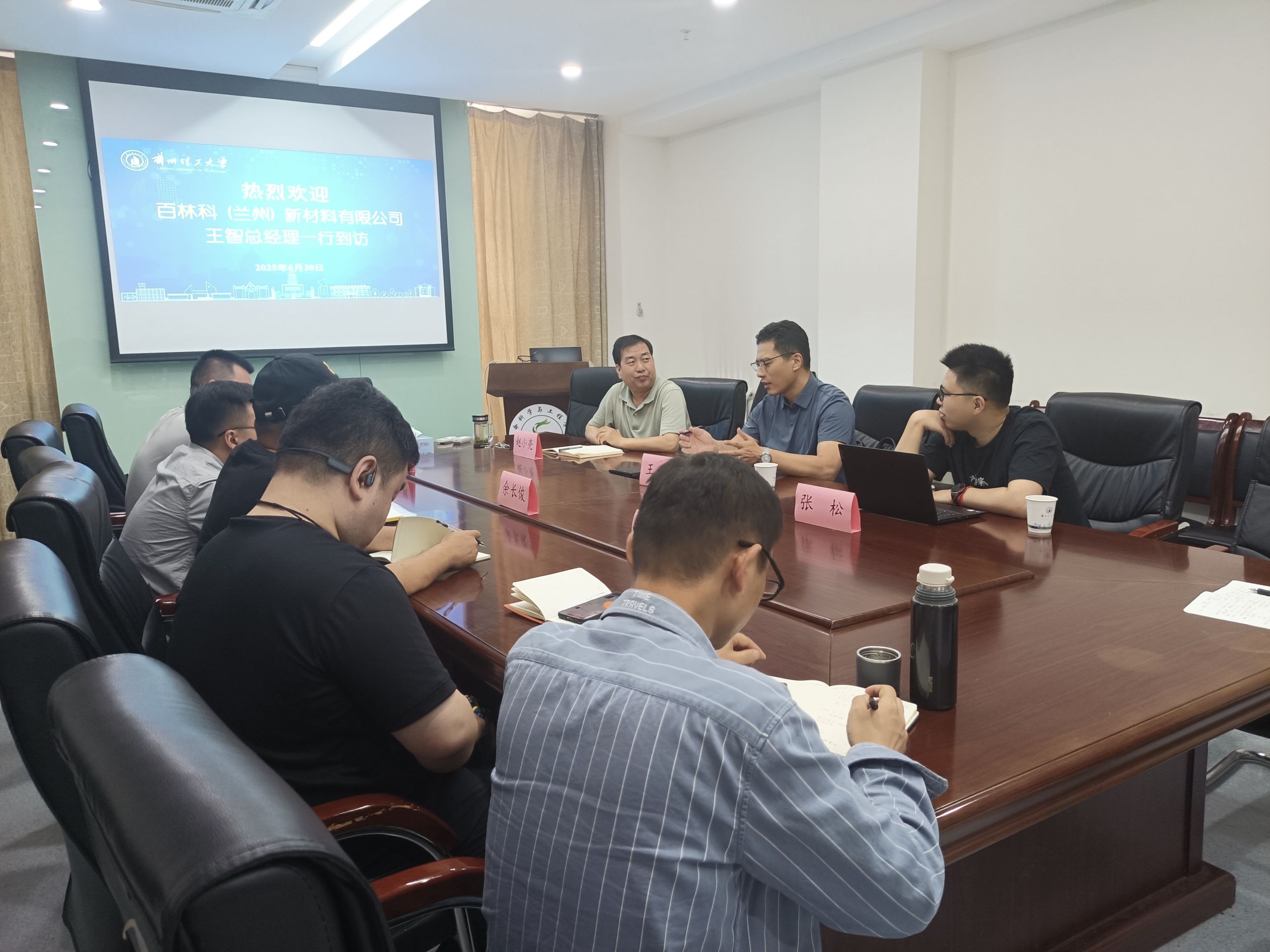 6月20日上午,百林科(蘭州)新材料有限公司總經理王智、研發(fā)總監(jiān)張松一行到訪生命科學與工程學院。學院青年教師代表田輝、余長俊、成斌、王克榮和石任杰參加座談,學院副院長趙小亮主持座談會。